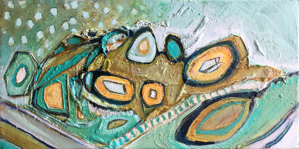FROM THE DEPTHS • I remember the first time I squinted into the lens of a microscope, or later, into a telescope that zipped me away to ride on the rings of Saturn and hopscotch through galaxies afar.I would get lost in the great depths of the untamed ocean whenever I would happen upon an aquarium, imagining myself flying through the reef and navigating the dangerous waters. Even now, I find myself mesmerized by my surroundings, wishing I could freeze-frame the rush of the here-and-now and share my sense of awe and wonderment of the earth. The interconnectedness of the organic world, from the microscopic to the geological to the celestial, is a true testament to the majesty and mystery of life. The universality of the organic shapes, colors and line invite the imagination to play with the infinite possibilities to be found within my paintings. [These small abstract pieces lend themselves well to being shown in a cluster, grid or pairing and because they can be hung any of the four direction, the curatorial possibilities are also endless!]